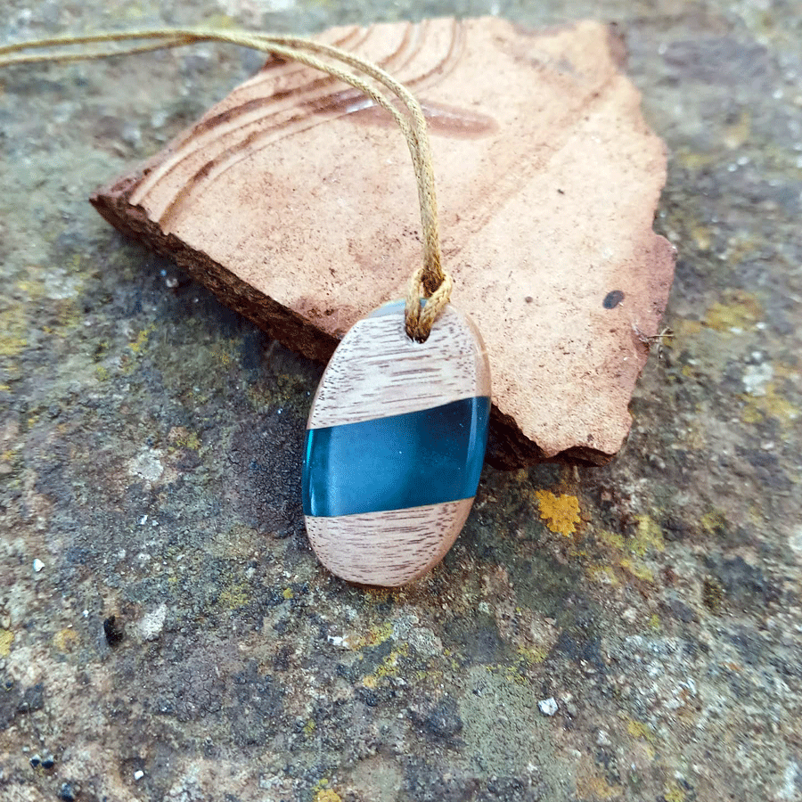 Oval shaped, slightly asymetric pendant made out of driftwood and transparent blue epoxy resin.